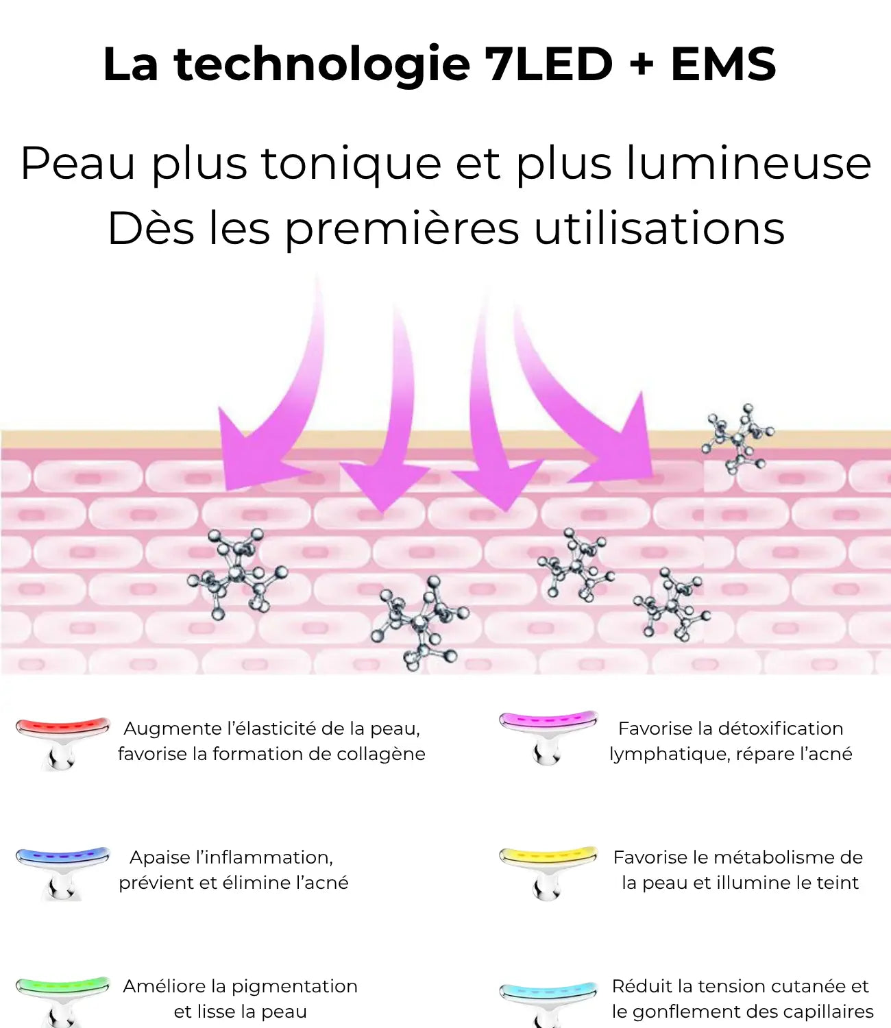 Technologies : Thérapie ionique, EMS, Vibration sonique, Luminothérapie, Thérapie par la chaleur.